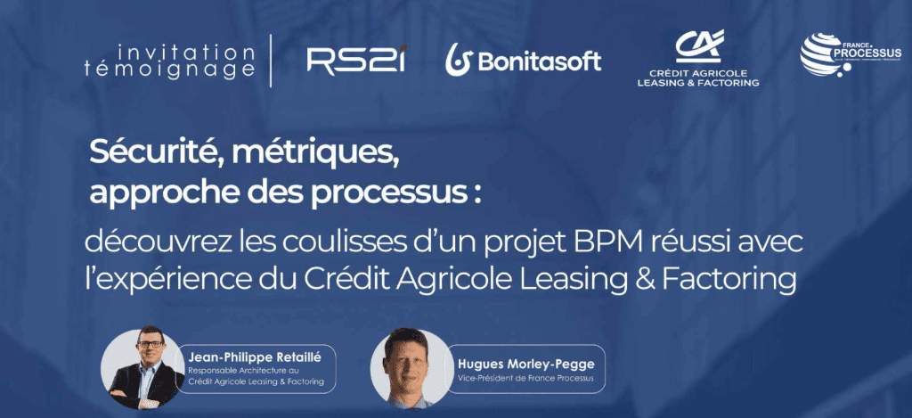 Au programme, un retour d’expérience rare de Jean Philippe Retaillé de Crédit Agricole Leasing & Factoring, partagé en toute transparence : comment un projet BPM à forts enjeux a été structuré, sécurisé et mené avec succès avec le savoir-faire des équipes de CALF renforcé par l’expertise de Bonitasoft & RS2i.